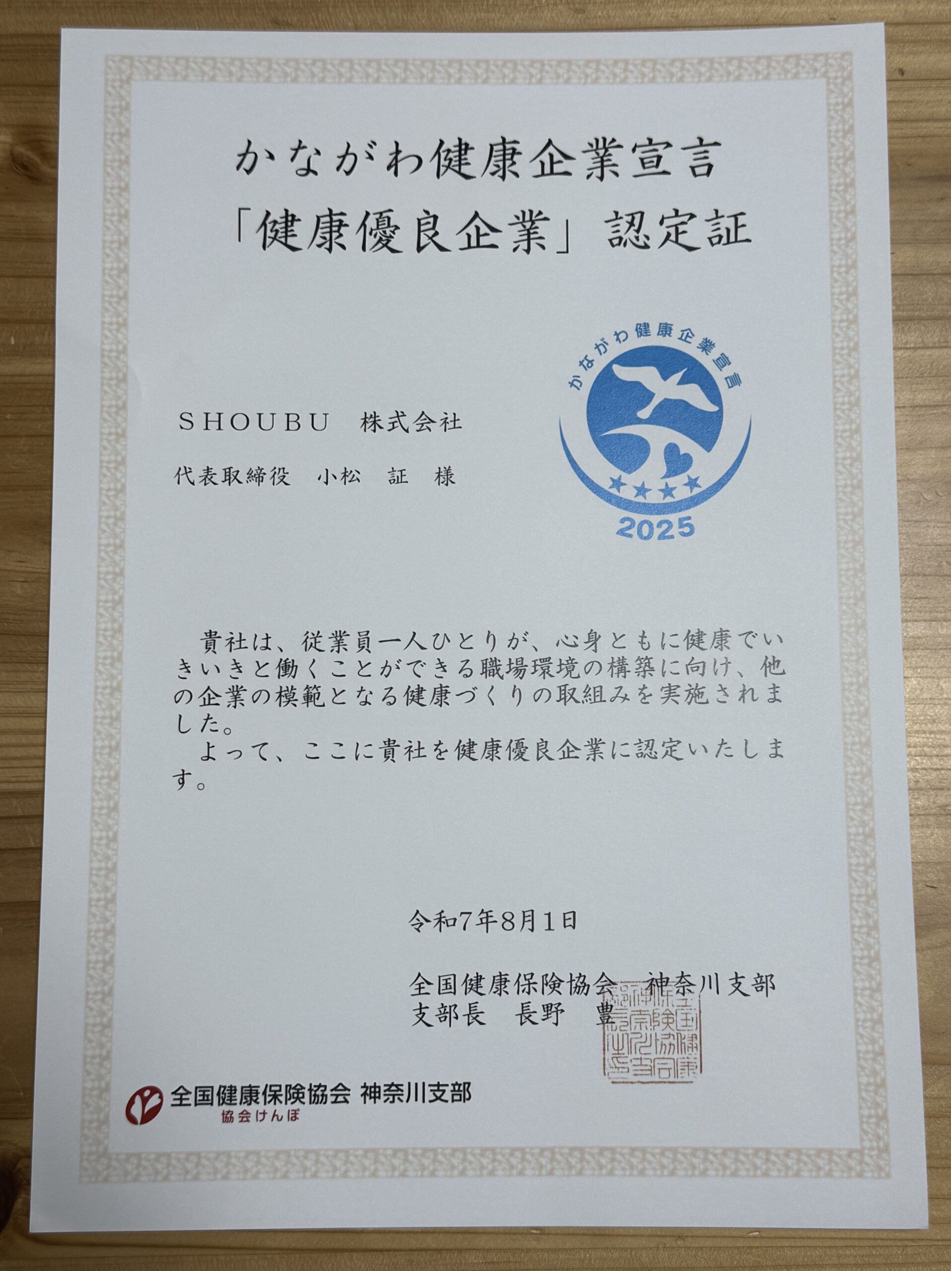 全国健康保険協会から当社の働き方などを評価していただき、「健康優良企業」と認定していただきました。